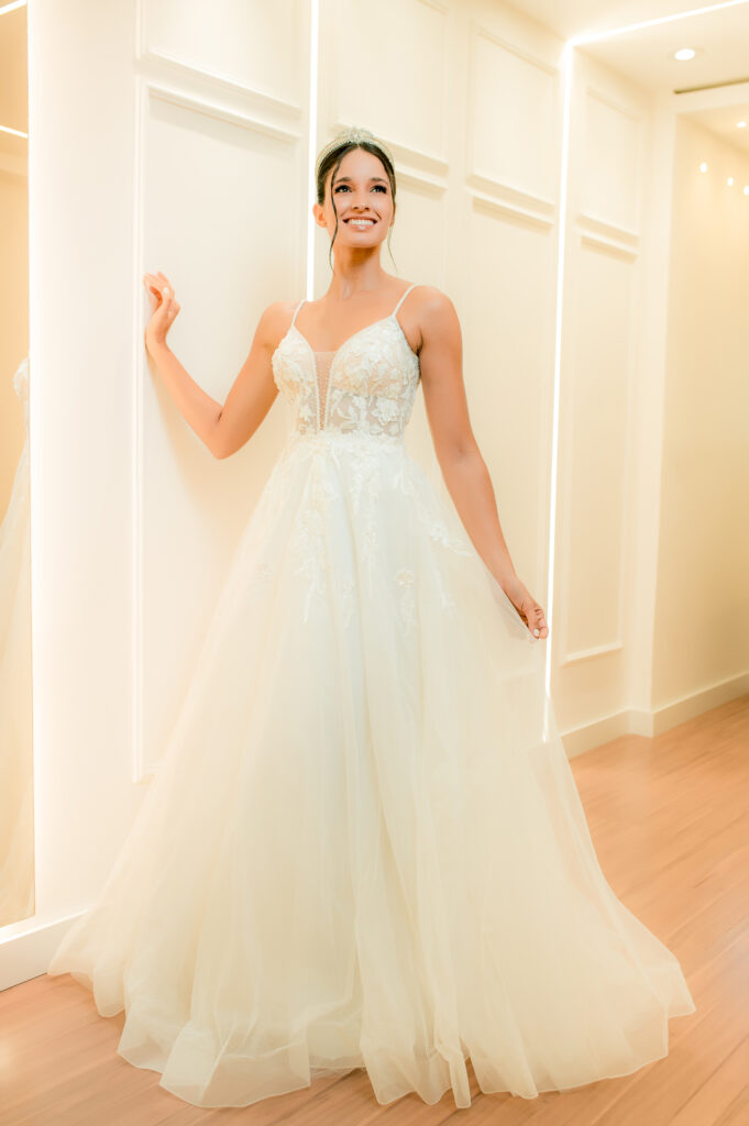 “Encontrei a Zárex por indicação e adorei, o atendimento foi maravilhoso e me apaixonei pelo vestido logo que eu vi. Eu não sabia descrever o vestido dos meus sonhos, mas quando eu vesti, sabia que era ele.”