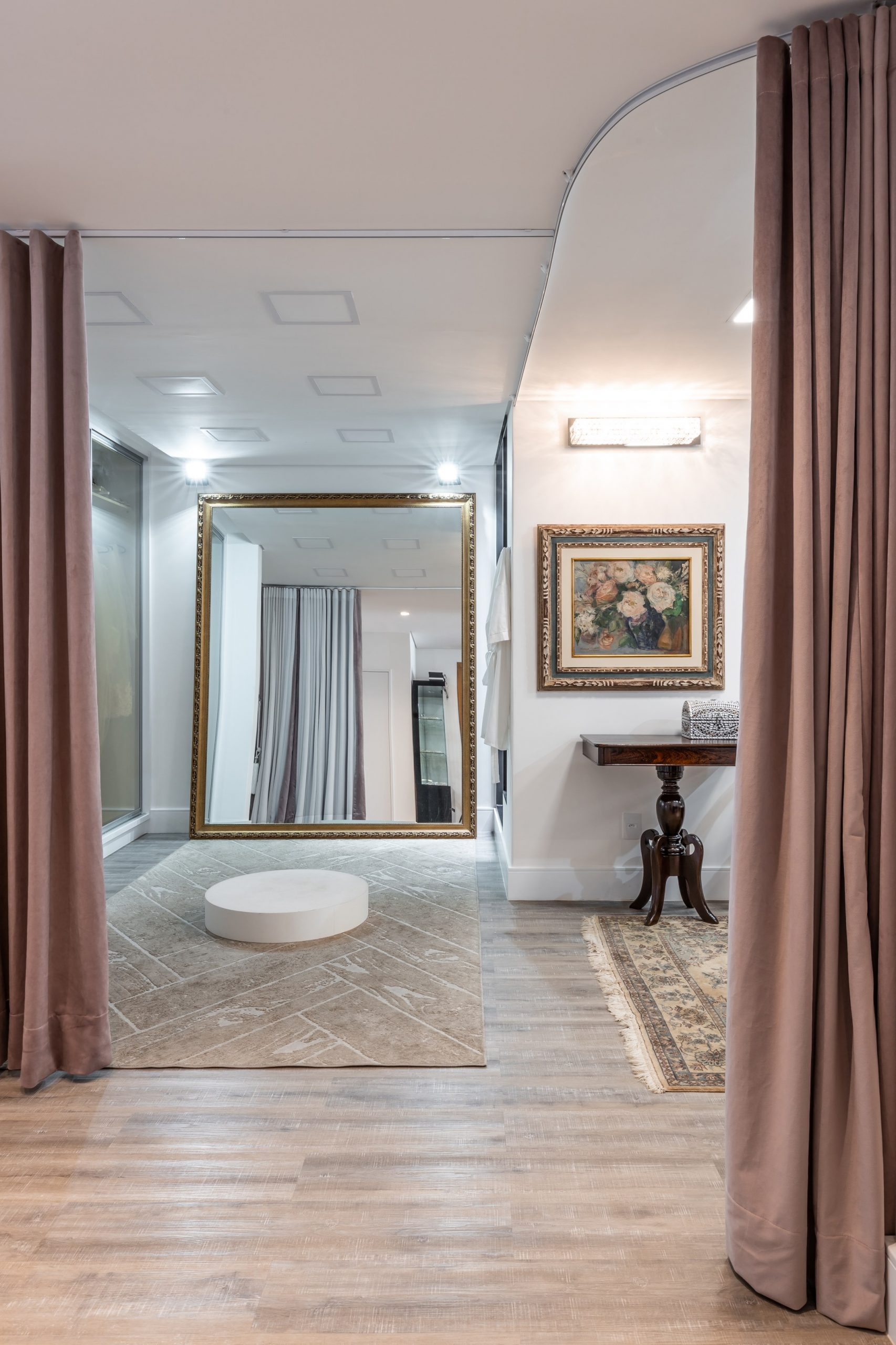 Temos uma sala reservada apenas para a noiva provar os vestidos, com espelhos em todos os lados, para que ela consiga visualizar como ficou o vestido em seu corpo por vários ângulos.