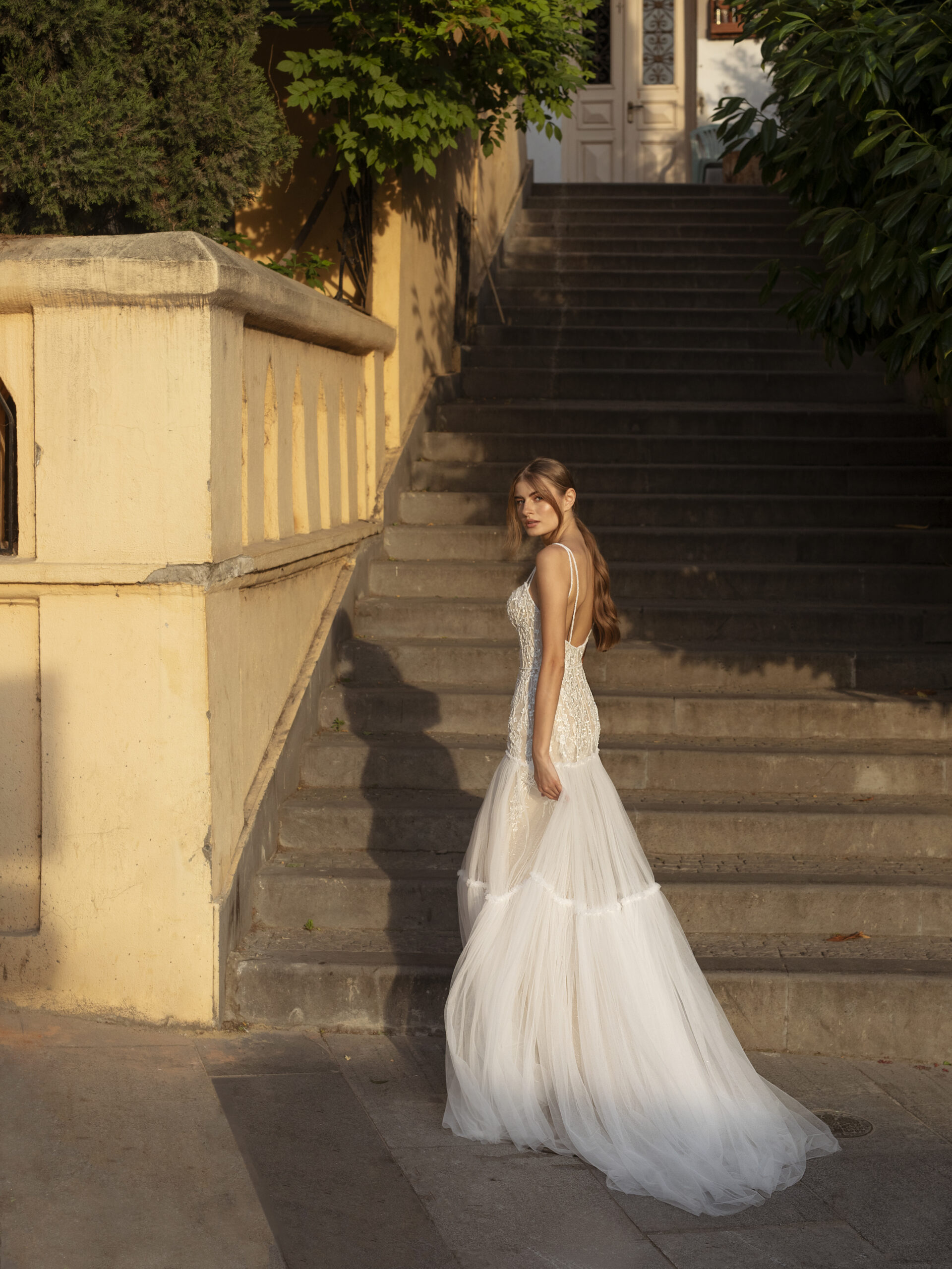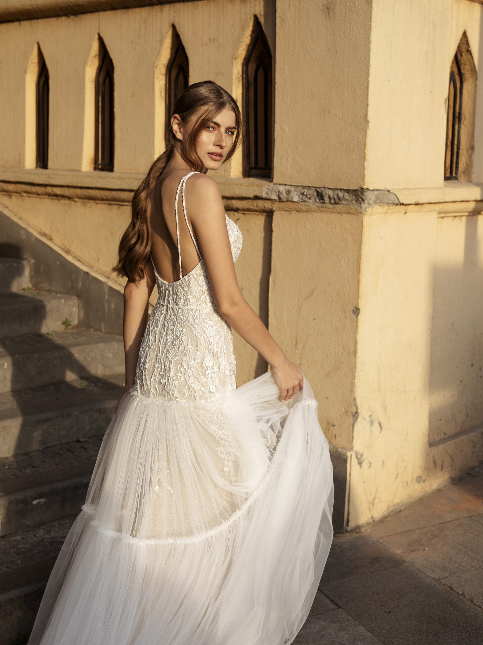 Incorpore o romance boêmio neste deslumbrante vestido de renda da Anna. Projetado com um decote sexy e detalhado com renda floral por toda parte, não podemos deixar de imaginar este vestido de linha A em um glamoroso casamento no jardim.