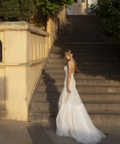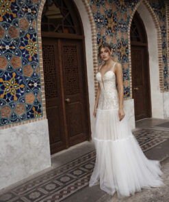 Incorpore o romance boêmio neste deslumbrante vestido de renda da Anna. Projetado com um decote sexy e detalhado com renda floral por toda parte, não podemos deixar de imaginar este vestido de linha A em um glamoroso casamento no jardim.