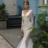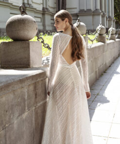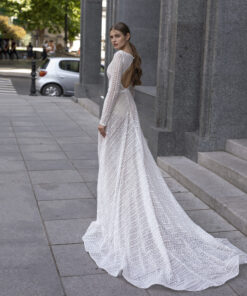 Vestido de noiva branco transparente com um design de renda único em forma de linha A. Para um visual dramático, este vestido tem um decote profundo, costas meio abertas e mangas compridas. O comportamento atrevido de Brigitte é reforçado pela longa cauda, que não é para os fracos de coração.
