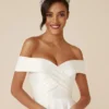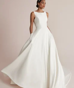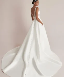 Fique deslumbrante neste clássico vestido de noiva Mikado em modelo princesa. O decote Sabrina é complementado com um cinto embutido que valoriza a silhueta, enquanto as costas ganham um toque de glamour com bordados prateados e detalhes intrincados em pérolas. O estilo é finalizado com bolsos e botões de cristal que caem até o véu de comprimento catedral.