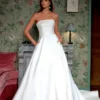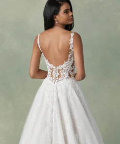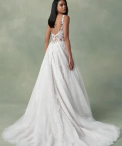Este vestido de noiva atemporal é feito para o seu caminho até o altar. A decote em V profundo segue por finas alças de ilusão que levam a um costas baixas com decote em U. Delicados pontos em treliça se entrelaçam com aplicações de renda tonal com pérolas e lantejoulas por todo o vestido. O corpete de tule transparente tem uma camada deslumbrante de Chantilly com lantejoulas que se estende até a saia e brilha à luz. Um véu de comprimento capela completa a silhueta tradicional de saia volumosa.