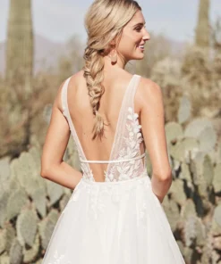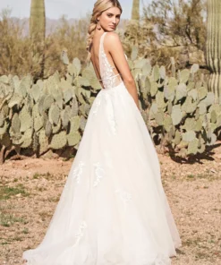 Sinta-se parte de um sonho neste delicado vestido de noiva em tule. A leve aplicação de pedrarias se mistura com a renda suave, adornando o decote profundo e as costas baixas. Recortes laterais e faixas duplas na cintura destacam o corpete sensual. Camadas de suave rede inglesa completam o visual romântico. Este modelo também está disponível com o corpete frontal forrado até os recortes laterais de ilusão.