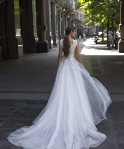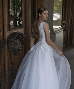 O Lago dos Cisnes colide com o Met Gala. Um decote profundo, costas abertas e rendas bordadas delicadas e pesadas em forma de penas de cisne sobre um espartilho curto e sedutor caracterizam este vestido de noiva creme sem mangas. A saia do vestido é composta por camadas de tule e tem uma cauda requintada.