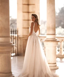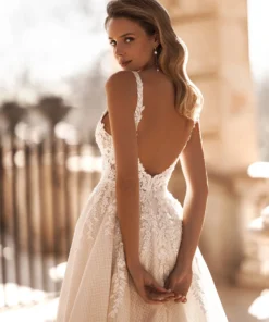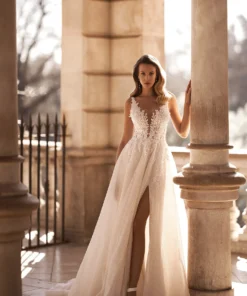 Este lindo vestido de noiva apresenta uma silhueta em linha A, confeccionada com delicada renda por toda a peça e tule com glitter. O modelo foi desenhado com um profundo decote ilusão e um deslumbrante corpete adornado com apliques florais, detalhados de forma intricada com lantejoulas e miçangas. Electra também traz um toque moderno com uma fenda lateral na saia e um decote baixo nas costas. O vestido é finalizado com uma cauda corte, adicionando um toque extra de elegância ao design.