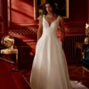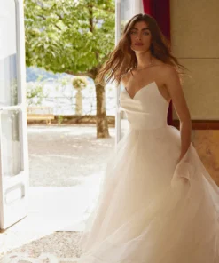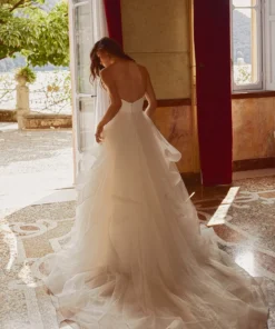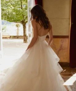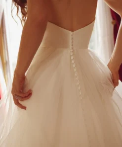 Infinity é um deslumbrante vestido de tule com bordas de crinolina. A saia volumosa e romântica com babados combina perfeitamente com o corpete de cetim. Seu decote em coração e as costas em V, com botões que seguem até o véu, completam o visual elegante.