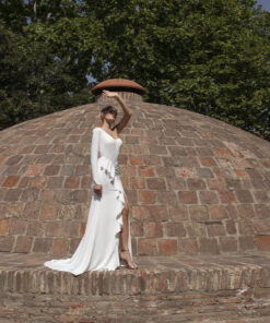 Vestido de noiva um ombro só com bainha em tecido crepe delicado e bonito. Uma manga, uma fenda alta, um decote em coração e um babado no quadril combinam-se para uma aparência mais magra e refinada com uma cauda longa imaculada. Jogue isso em seu traje para um visual sem esforço e despreocupado.