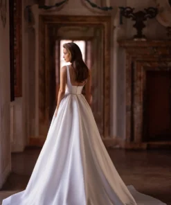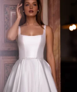 Este vestido de noiva minimalista e sofisticado em linha A, feito de mikado, é uma criação atemporal. O corpete apresenta um decote quadrado com cortes laterais em ilusão, adicionando um toque sutil de charme. Para um visual personalizável, o vestido inclui laços de mikado removíveis nos ombros, permitindo criar diferentes estilos com facilidade. A cintura é adornada à mão com contas e cristais meticulosamente posicionados, conferindo um brilho e glamour delicados. Para unir estilo e praticidade, o vestido conta com bolsos na saia. A peça é finalizada com uma cauda estilo capela, trazendo um toque de graça e sofisticação a este deslumbrante vestido de noiva.